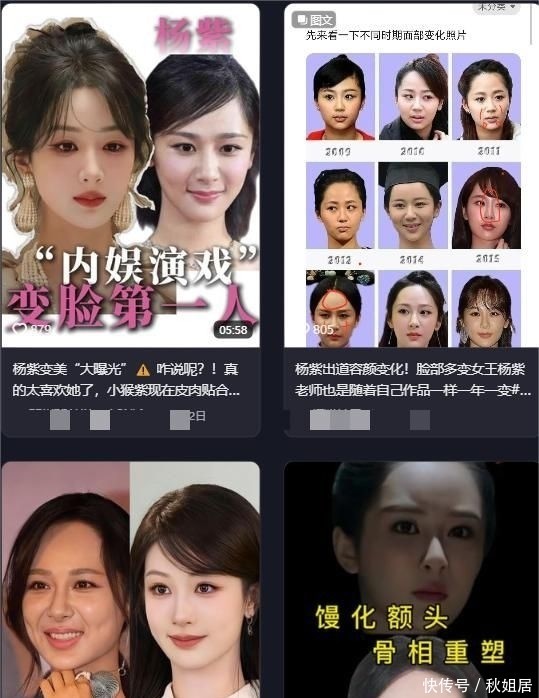网络上关于杨紫容貌转变的讨论持续发酵,“杨紫整容”“杨紫微调”“杨紫变脸”等话题频繁登上热搜。更有部分博主专门收集其面部细节差异,制作分析视频博取流量,被戏称为“吃紫血馒头”。